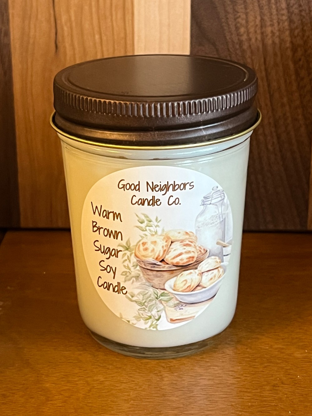 Warm Brown Sugar soy candle from Good Neighbors Candle Co in Lancaster County. 8 ounce glass jar with bronze lid.Cotton wick